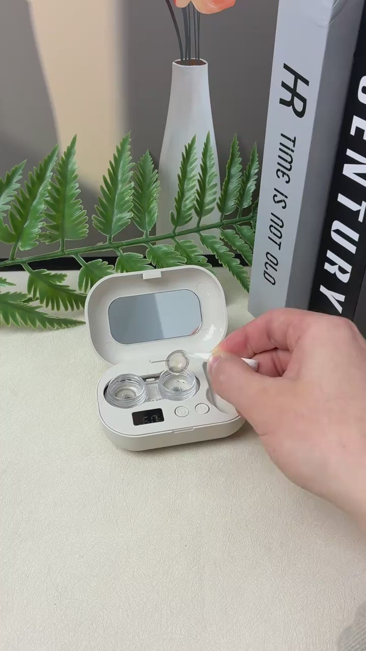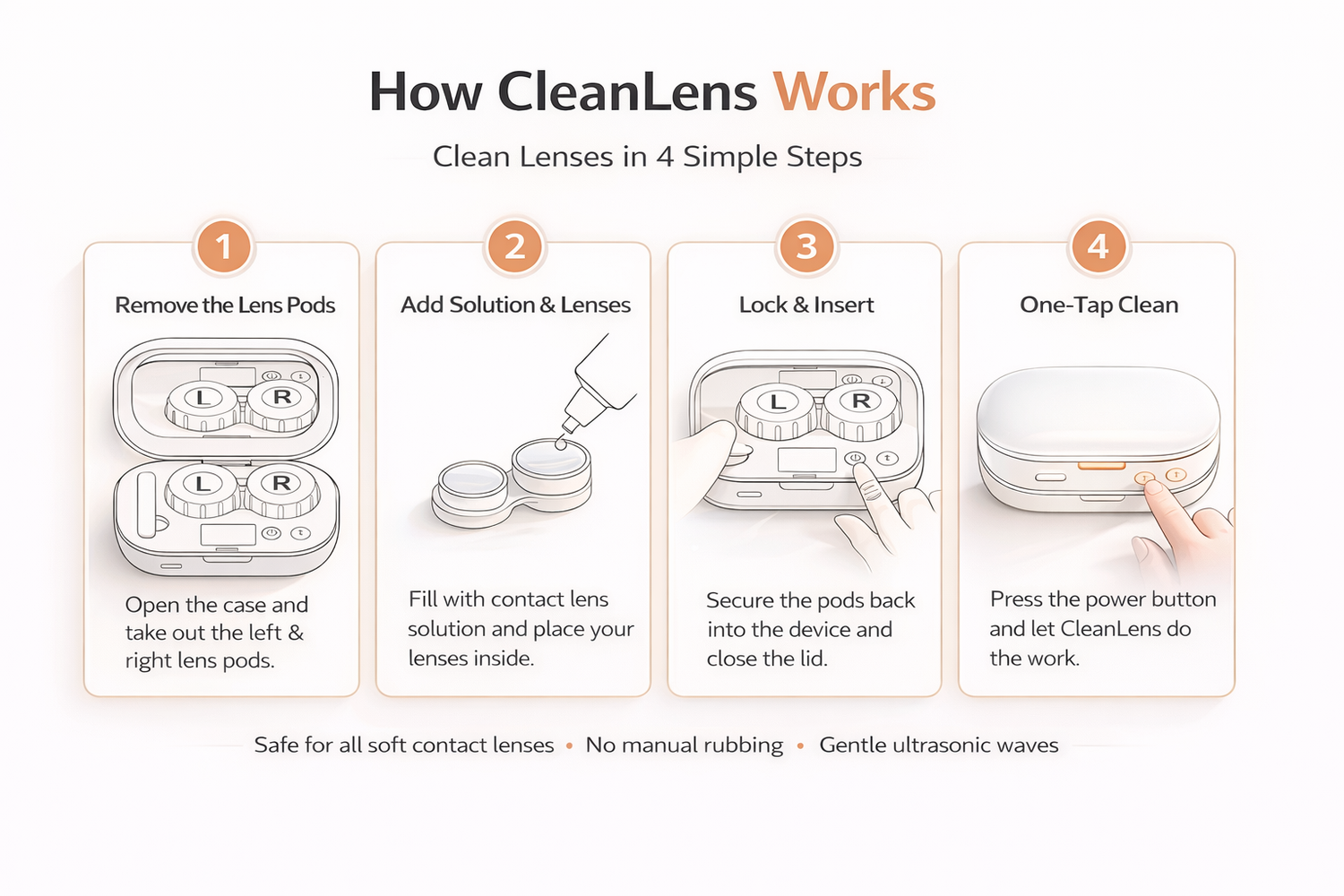 Clean your contact lenses in four simple steps using gentle ultrasonic vibration.
